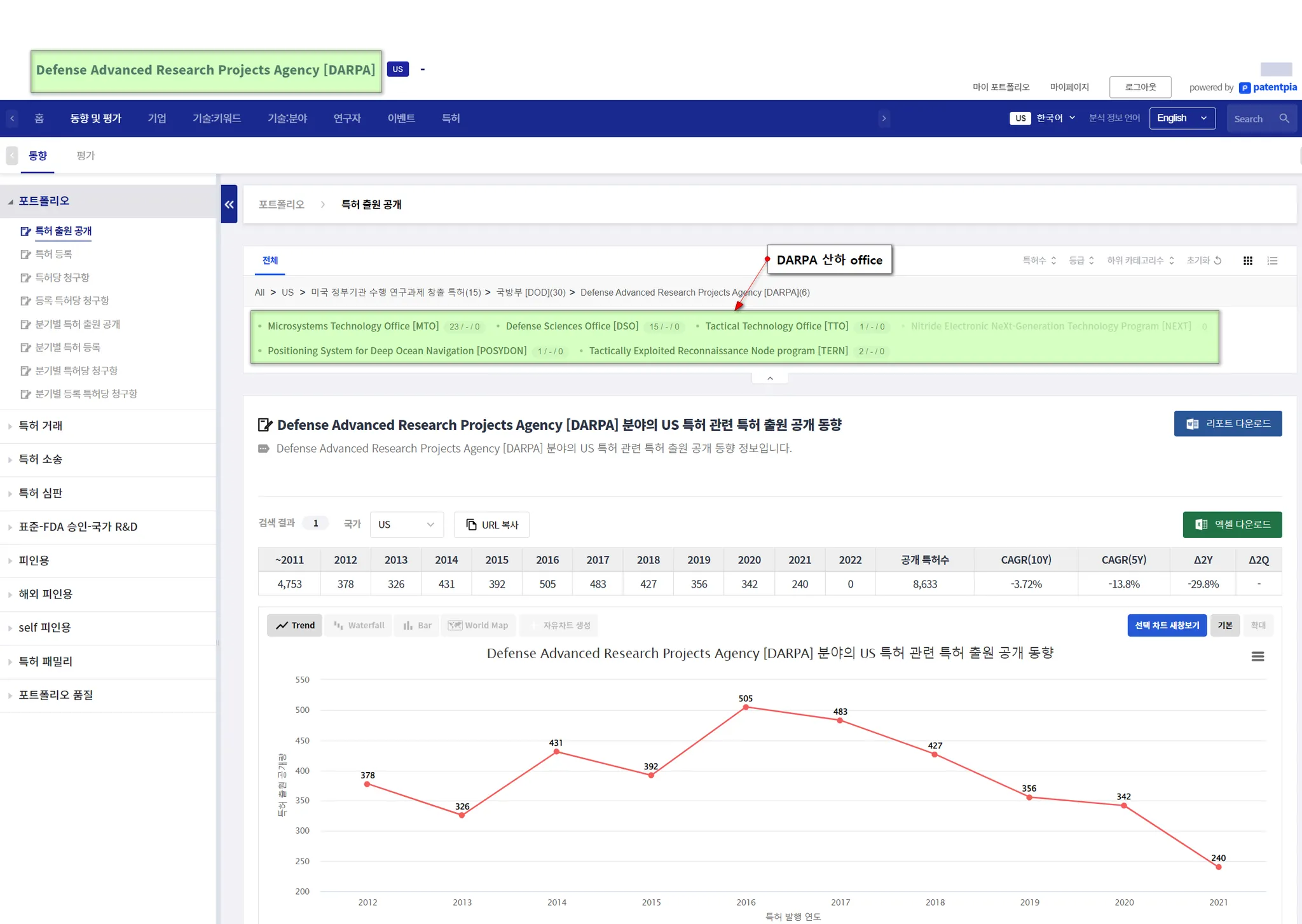 DARPA가 funding한 국가 R&D 과제 성과 특허에 대한 분석 콘텐츠가 나타납니다. DARPA 산하 office 단위로 분석하는 경우에는 목적하는 office를 선택하세요.