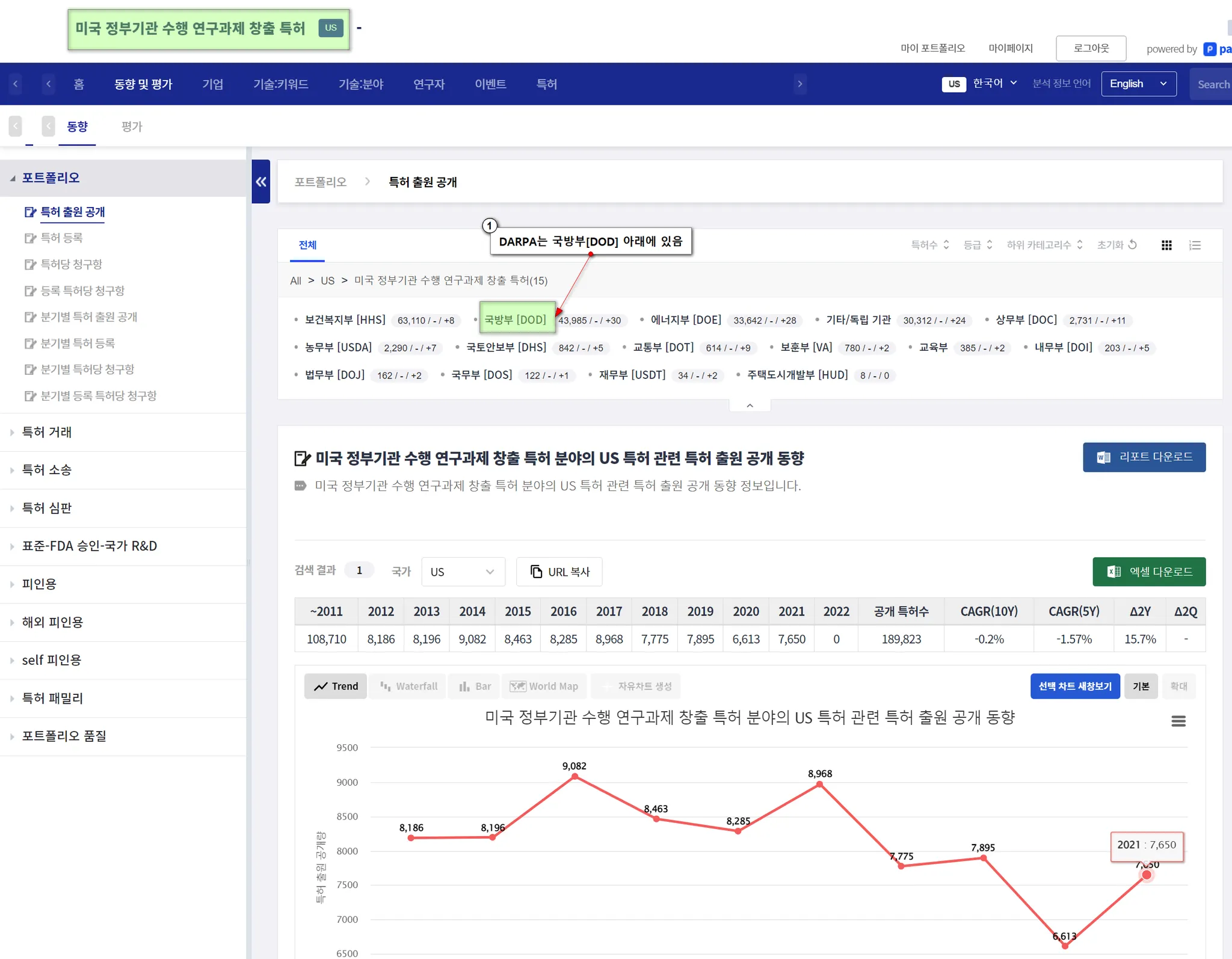 DARPA는 ’미국 정부기관 수행 연구과제 창출 특허’ 화면에서, 국방부[DOD]를 클릭하시면, DARPA가 포함된 국방부 산하 기관 리스트가 나오며, 여기서 DARPA를 클릭하면 됩니다.