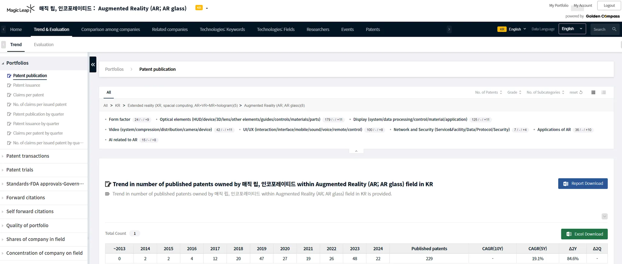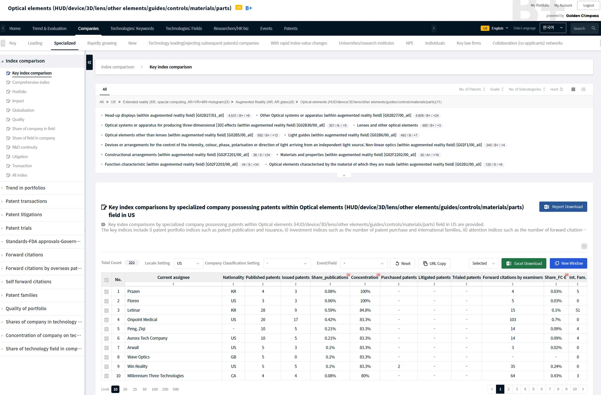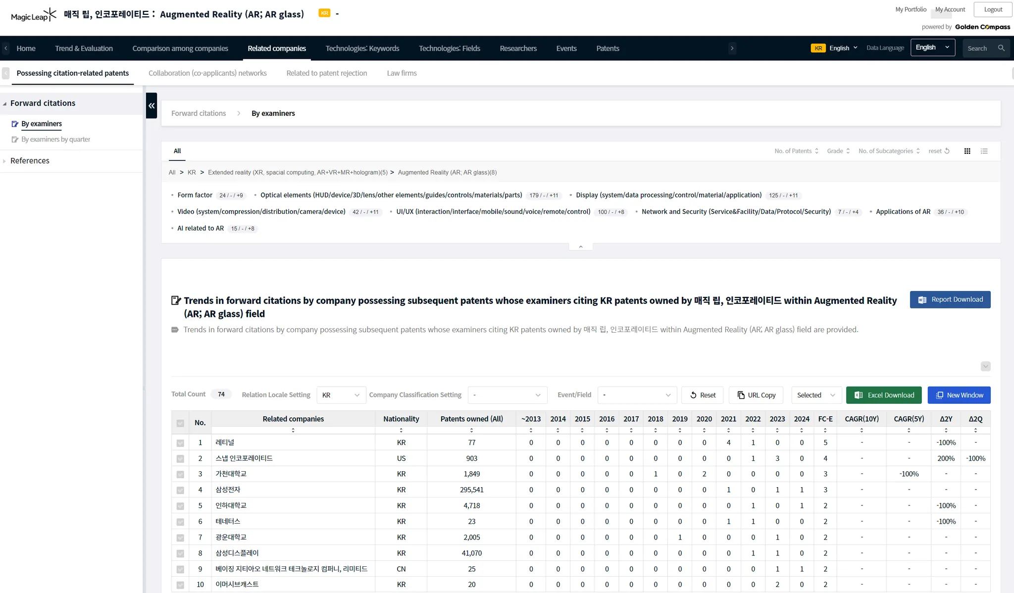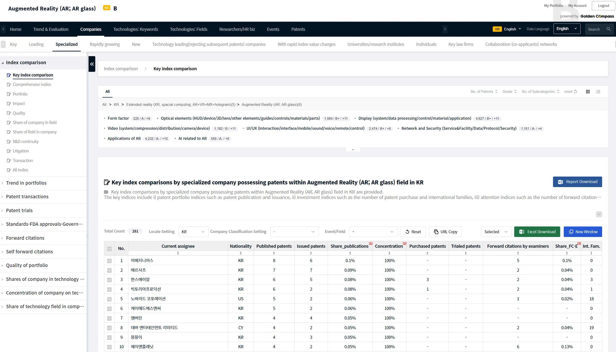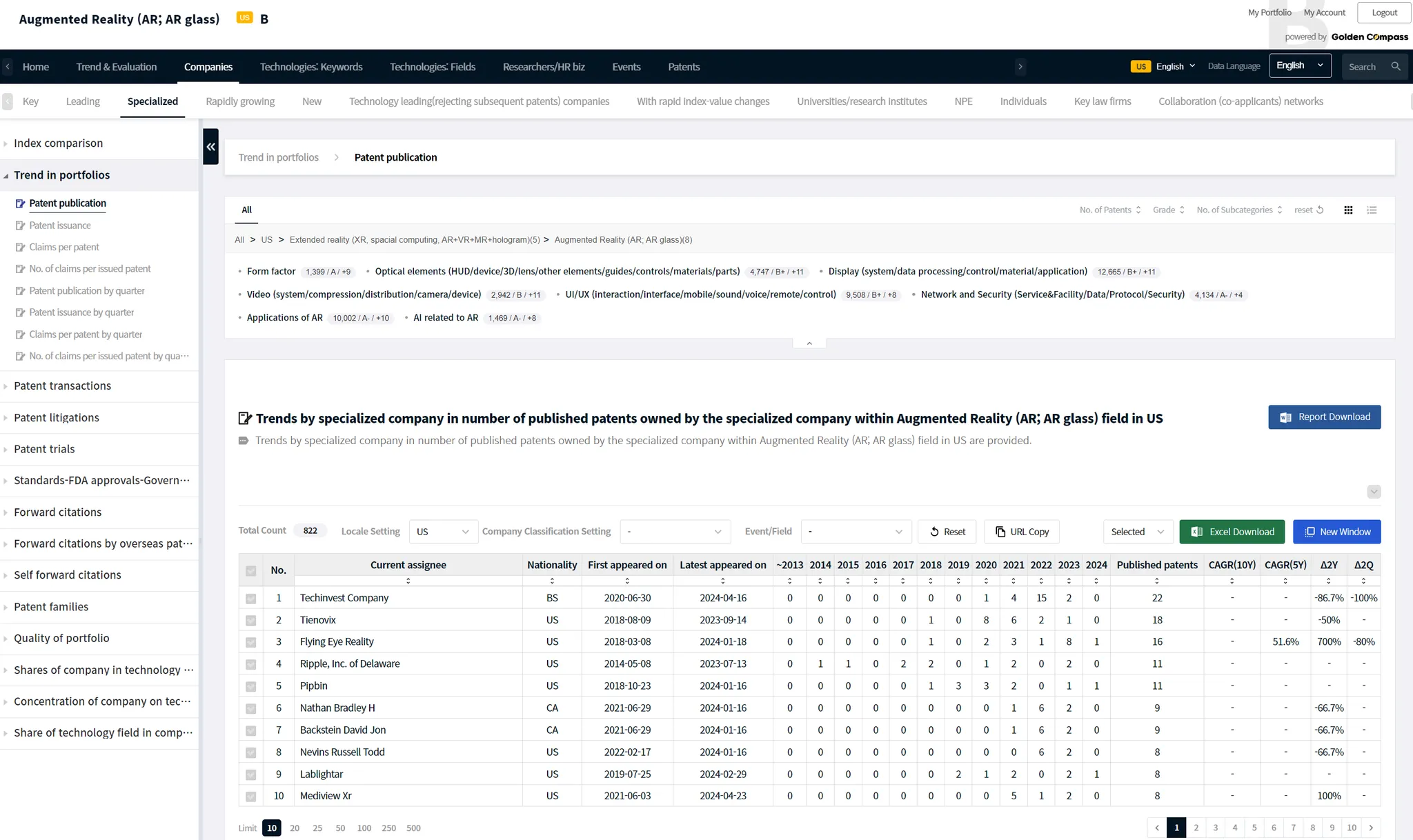 If there are sub-technology fields, such as technology categories or CPC patent classifications, you can select a subfield. The sub-technology fields for a specific technology field are located between the menu UI and the analysis results table. In the example below, you can see that the subfields of the AR field are “Form Factor,” “Optical elements,”...etc.