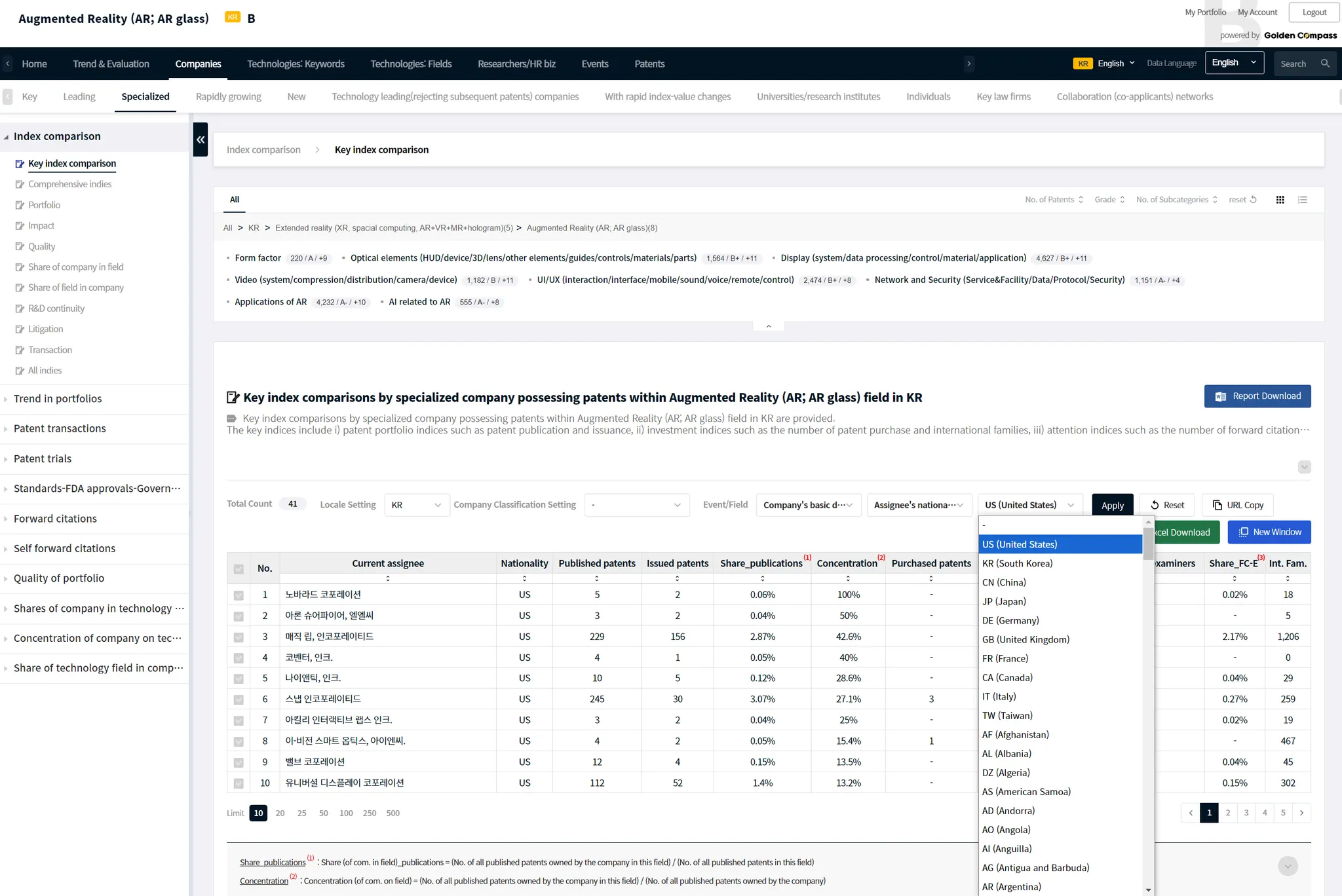 GoldenCompass provides information about specialized companies in a given technology field(shown at the top left of the page) under the 1 depth menu → Specialized companies 2 depth. Under the 3 depth menu, you can compare metrics for each company. In the index comparison, you can see that all companies on the page have a concentration rate of 100%. A concentration rate of 100% means that 100% of the patents in possession of these companies are patents related to field.