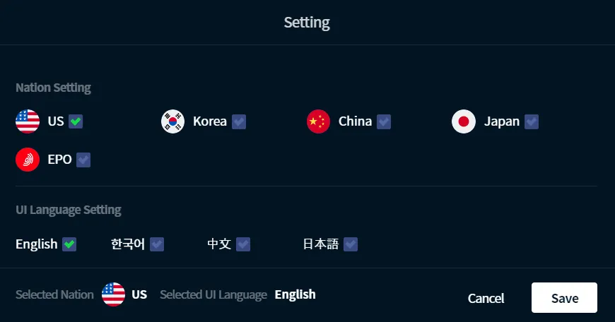 To change your nation, select the “Nationality-Language” selection UI shown below in the top right corner.