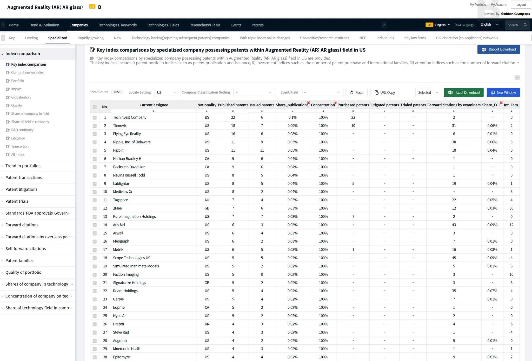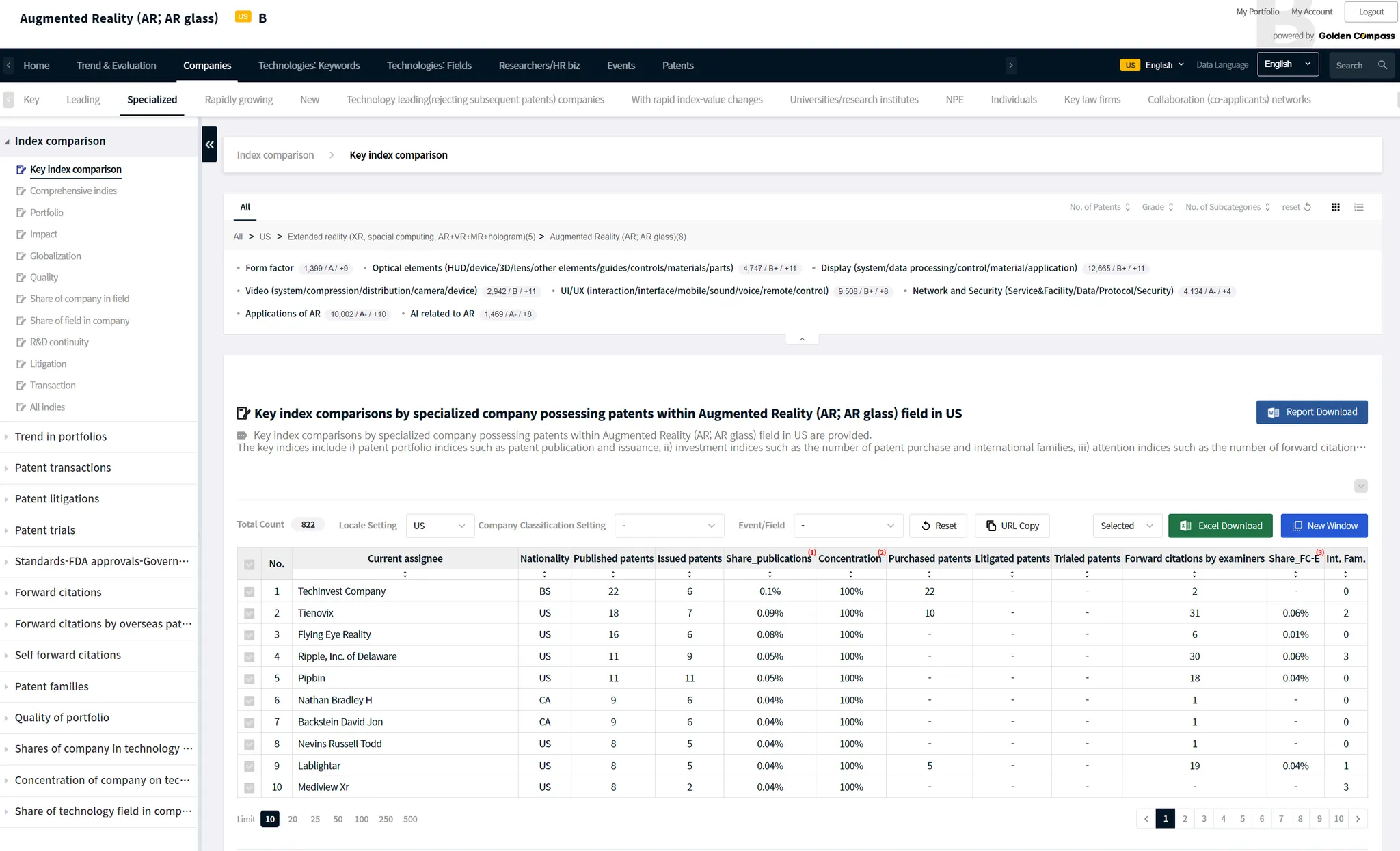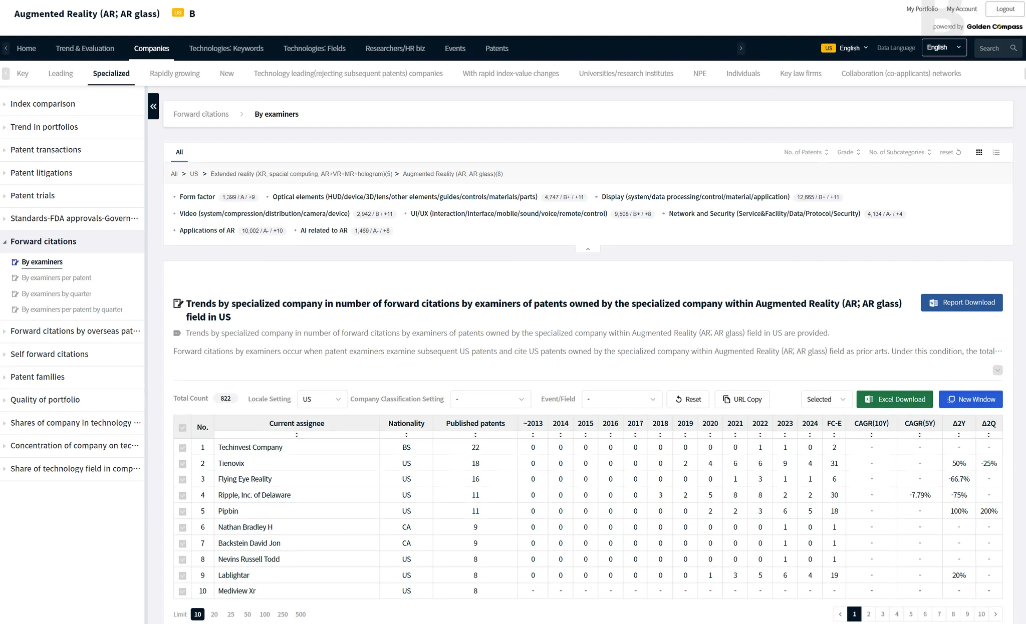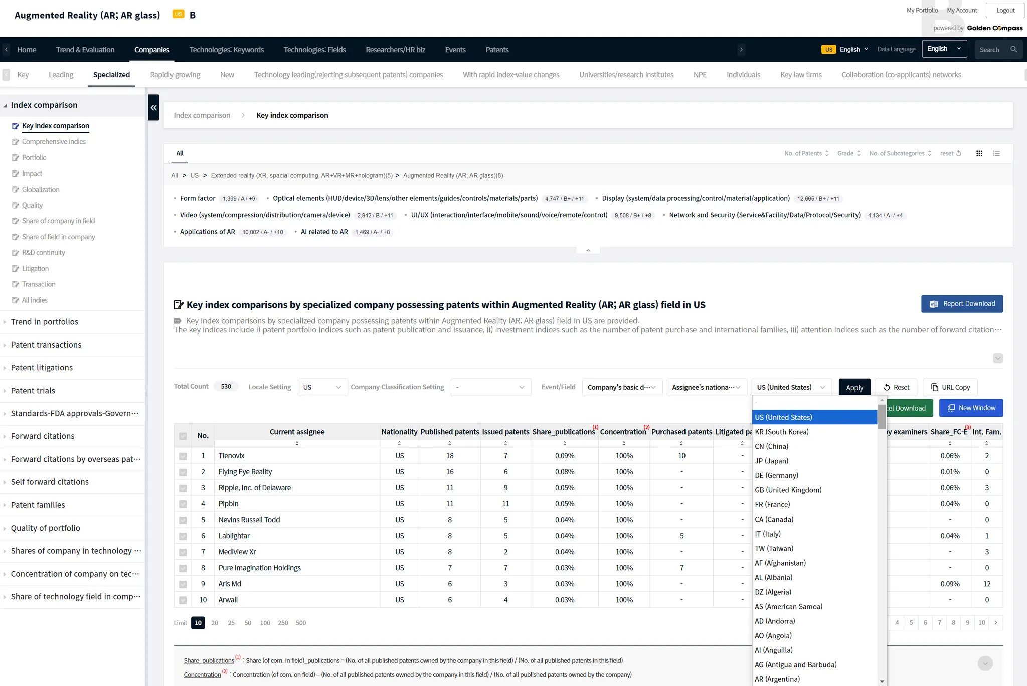 The example below is a GoldenCompass page for specialized companies focused on augmented reality (AR), an example of a technology field.