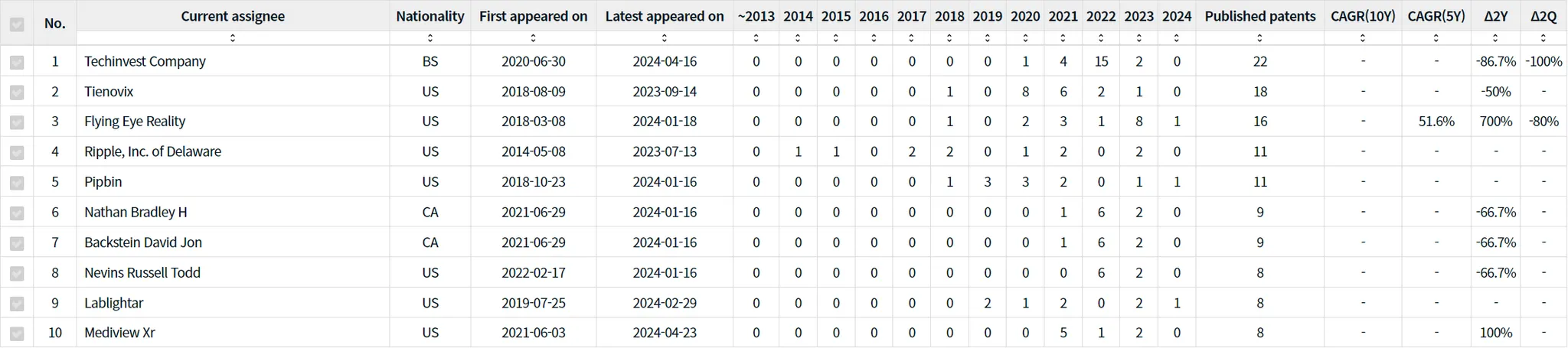 In the example below, Mediview Xr is a start-up company because its No. of patents in this field were first opened in 2021. However, Ripple, Inc. of Delaware may not be a startup company, depending on this view, because its No. of patents in this field were first opened in 2014.