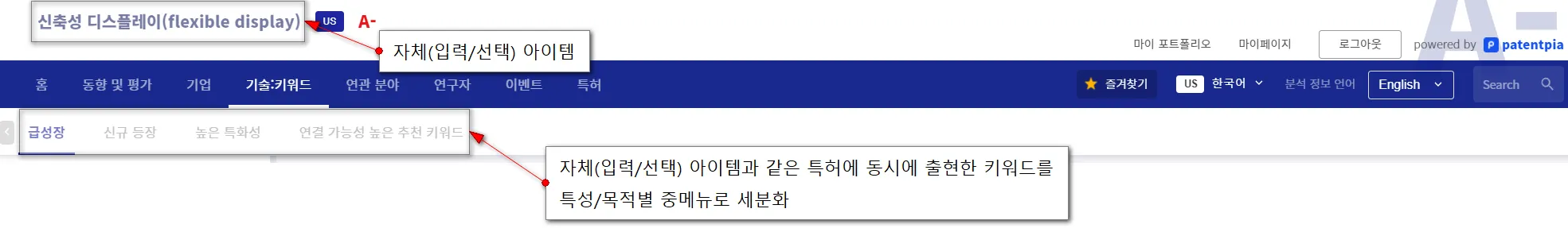 다른 분야에 비해서 "flexible display" 분야에 특화된 키워드의 발견을 목적으로 한다면, "높은 특화성" 중메뉴가 유용할 것이며,