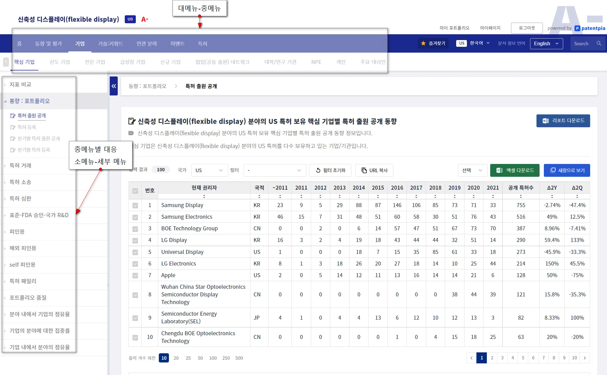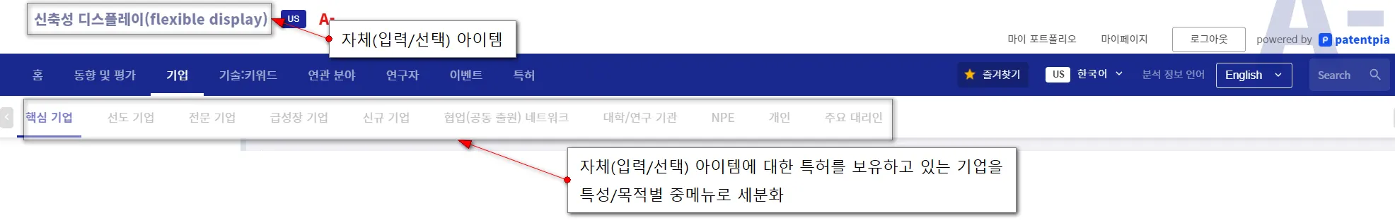다만, 입력되는 아이템에 따라 중메나 하위 메뉴가 차이가 날 수 있습니다. 예를 들면, "Apple"이라는 기업 아이템이 input으로 들어 오는 경우, "기업" 대메뉴 밑에는 "경쟁사"나 "연관 기업"과 같은 중메뉴가 나타납니다. 하지만, "flexible display"라는 키워드 아이템이 input으로 들어 오는 경우, "기업" 대메뉴 밑에는 "핵심 기업", "선도 기업", "급성장 기업", "전문 기업", "NPEs" 등과 같은 중메뉴가 나타납니다.