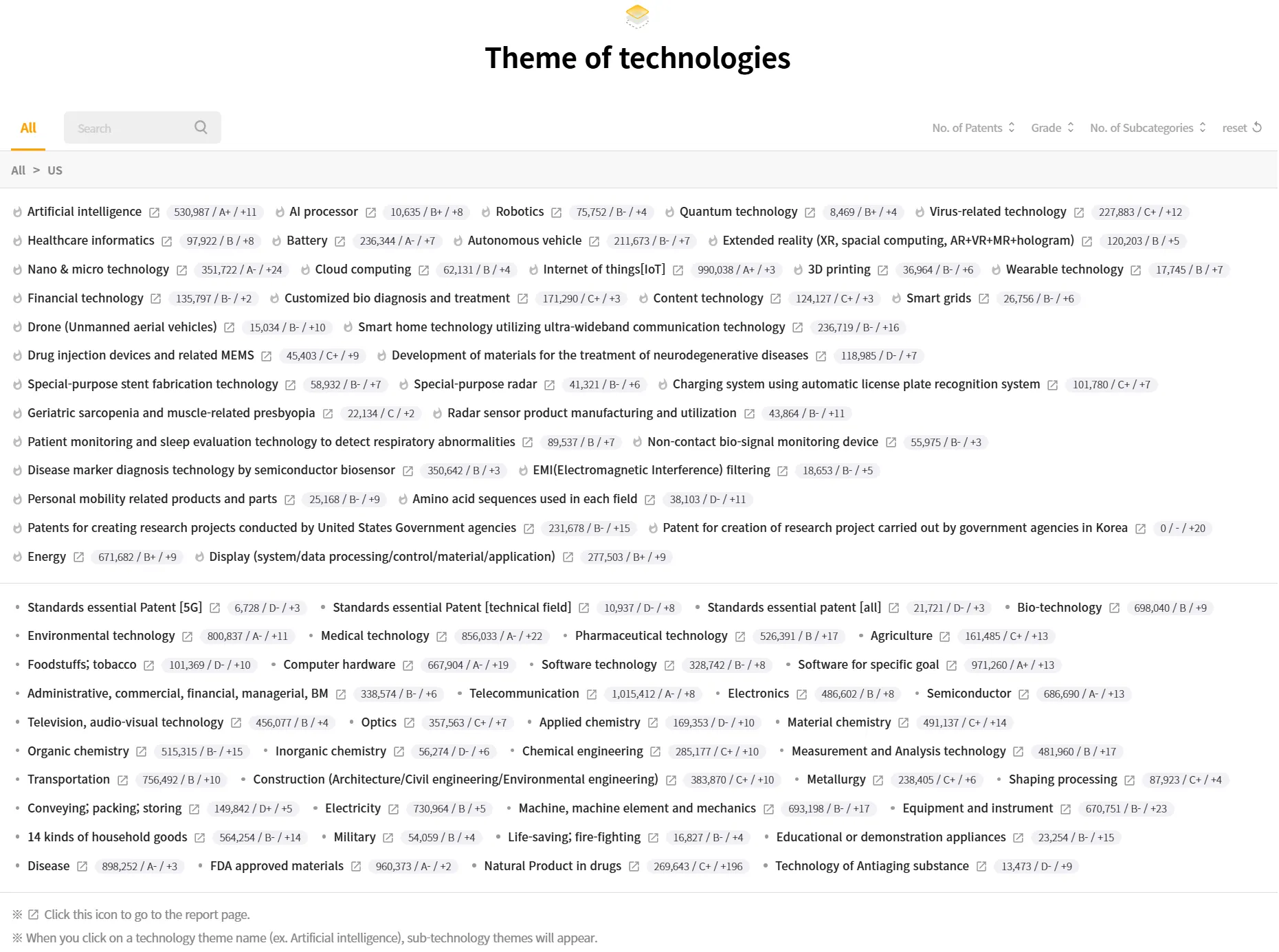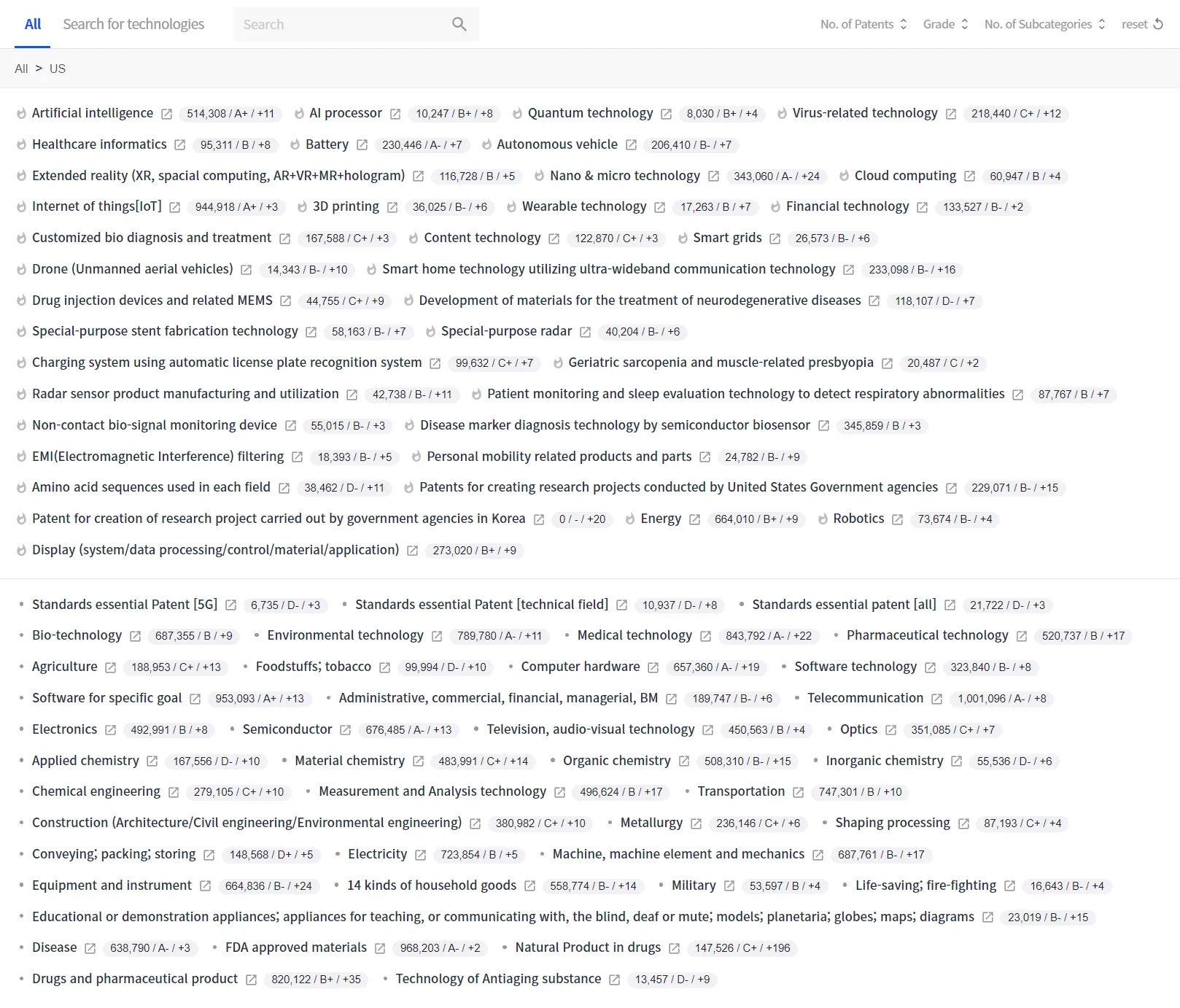 Of course, we also provide a search function. However, the search function requires that you know the technology or expression of the technology to enter as a search term. The advantage of browsing through the technology classification is that i) you will also see the technologies that are upper and lower, and ii) you will also see many other technologies that are neighboring or in equivalent categories.
