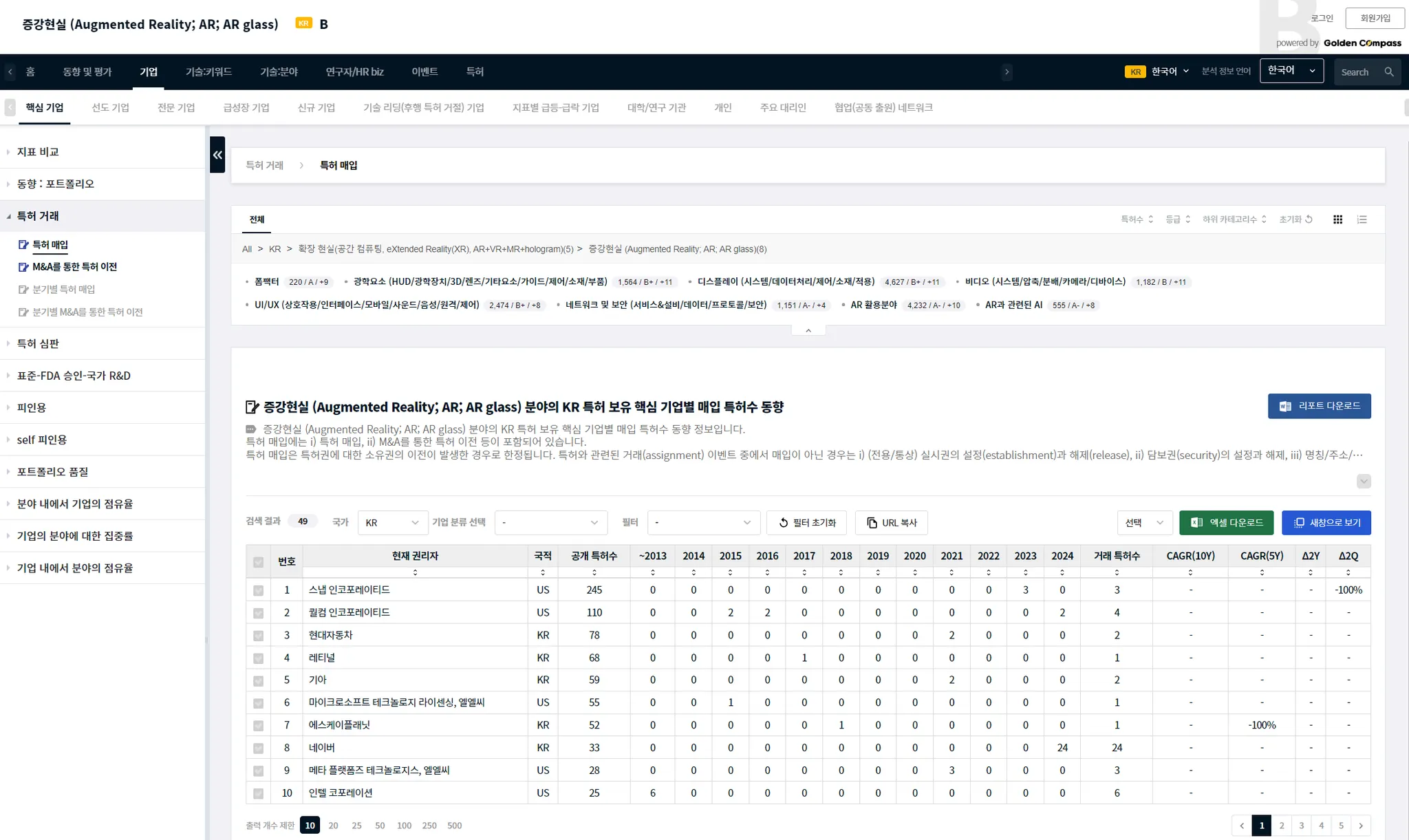 AR 기술 분야를 예시로, PatentPia GoldenCompass를 활용한 M&A/투자 대상 기업 발굴 콘텐츠를 제공합니다. 위 활용 지도의 각 항목에 결합되어 있는 사슬(링크) 표시를 클릭하면, 예시 화면이 새 창으로 열립니다.