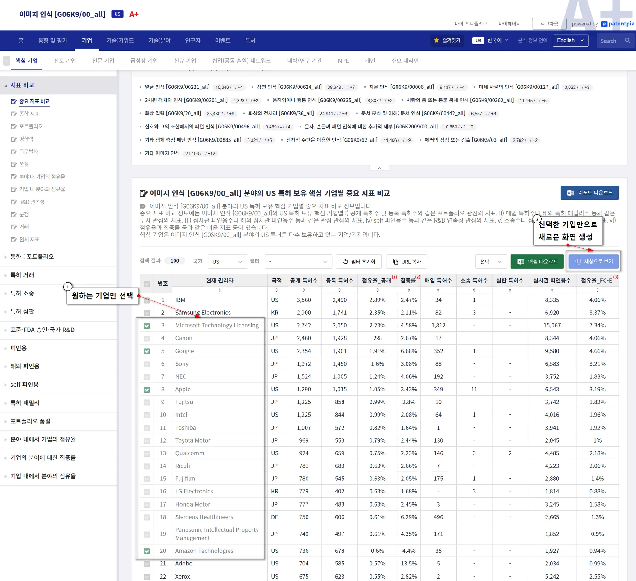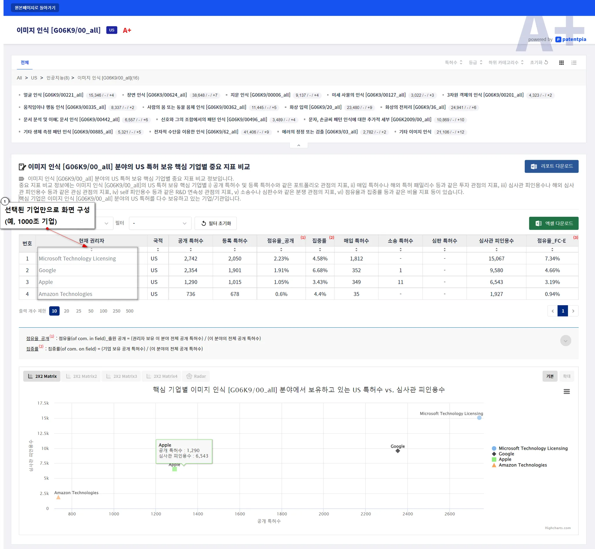 특정한 기술 분야나, 특정한 키워드 분야, 특정한 특허 분류(CPC/IPC) 분야에 한정된(not 전체 범위) 범위를 대상으로 한 기업별 분석은, 아래에 나오는 "동일 분야의 기업 비교 분석"을 참고하세요.