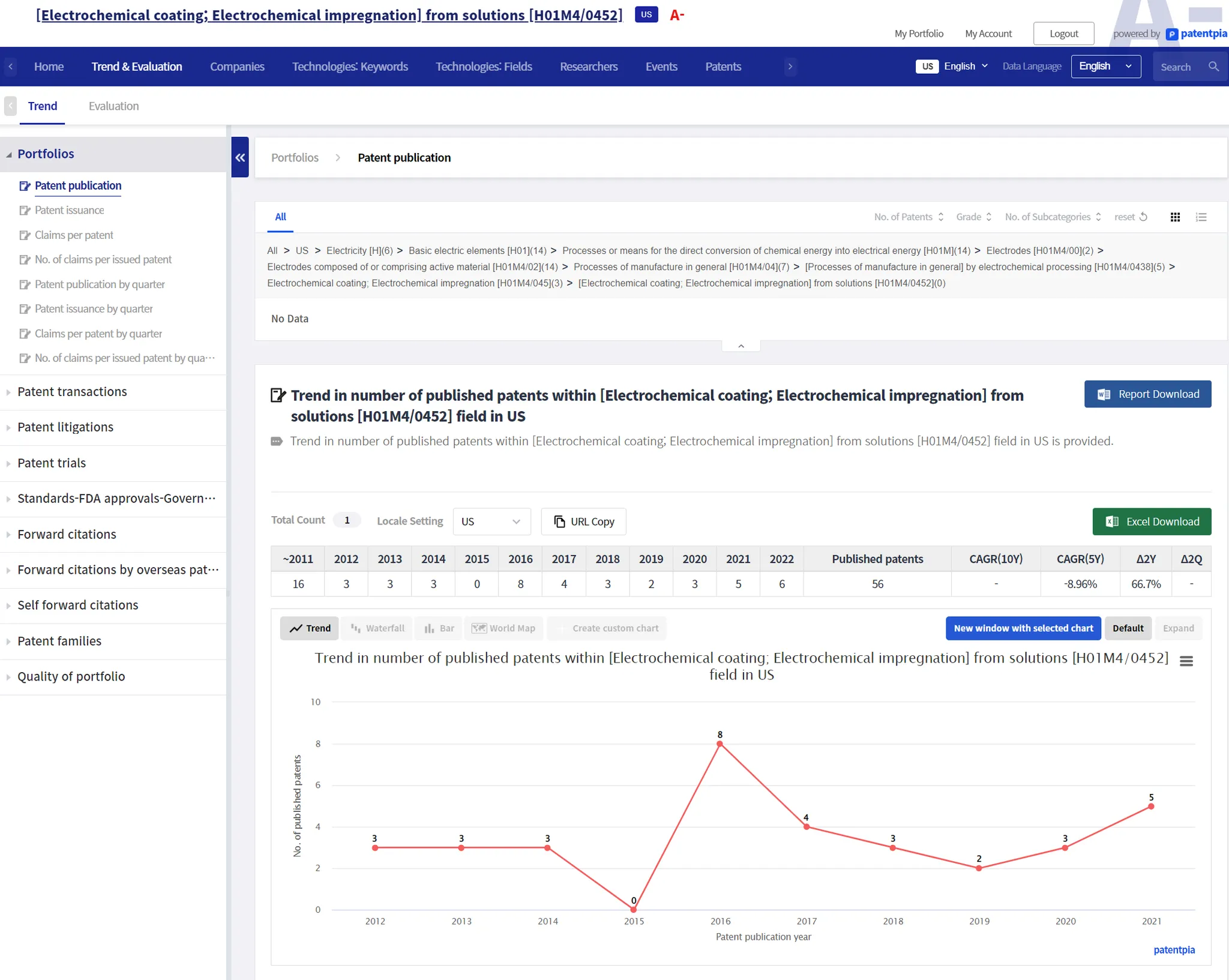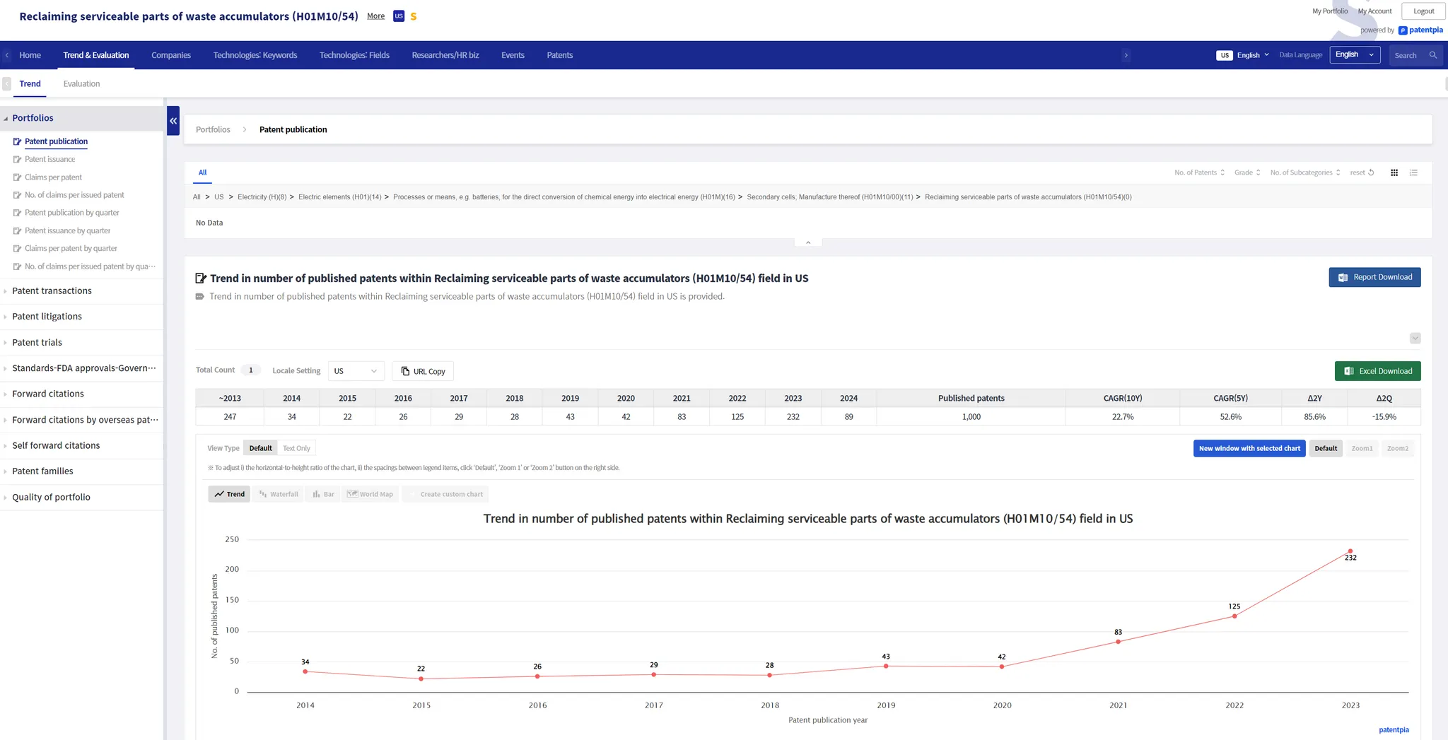 The example below shows the analysis contents of PatentPia GoldenCompass for CPC H01M10/54 (Reclaiming serviceable parts of waste accumulators).
