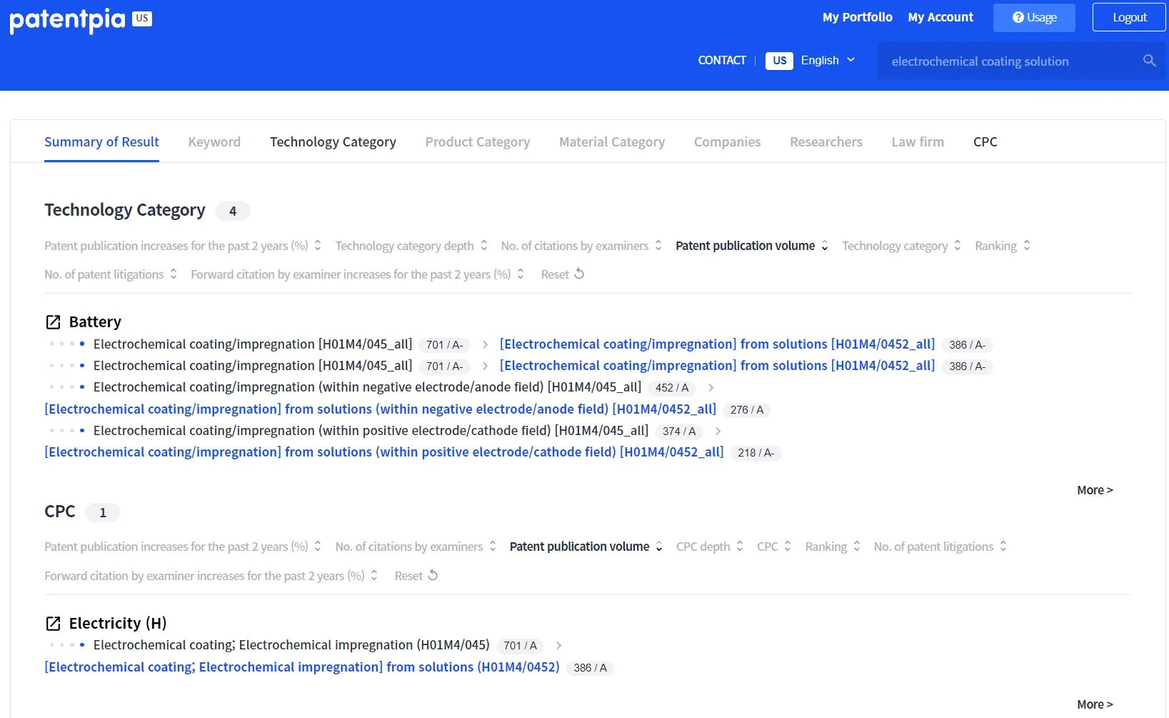 In the example below, H01M4/0452 appears as a CPC search result when "electrochemical coating solution" is entered as a search term.