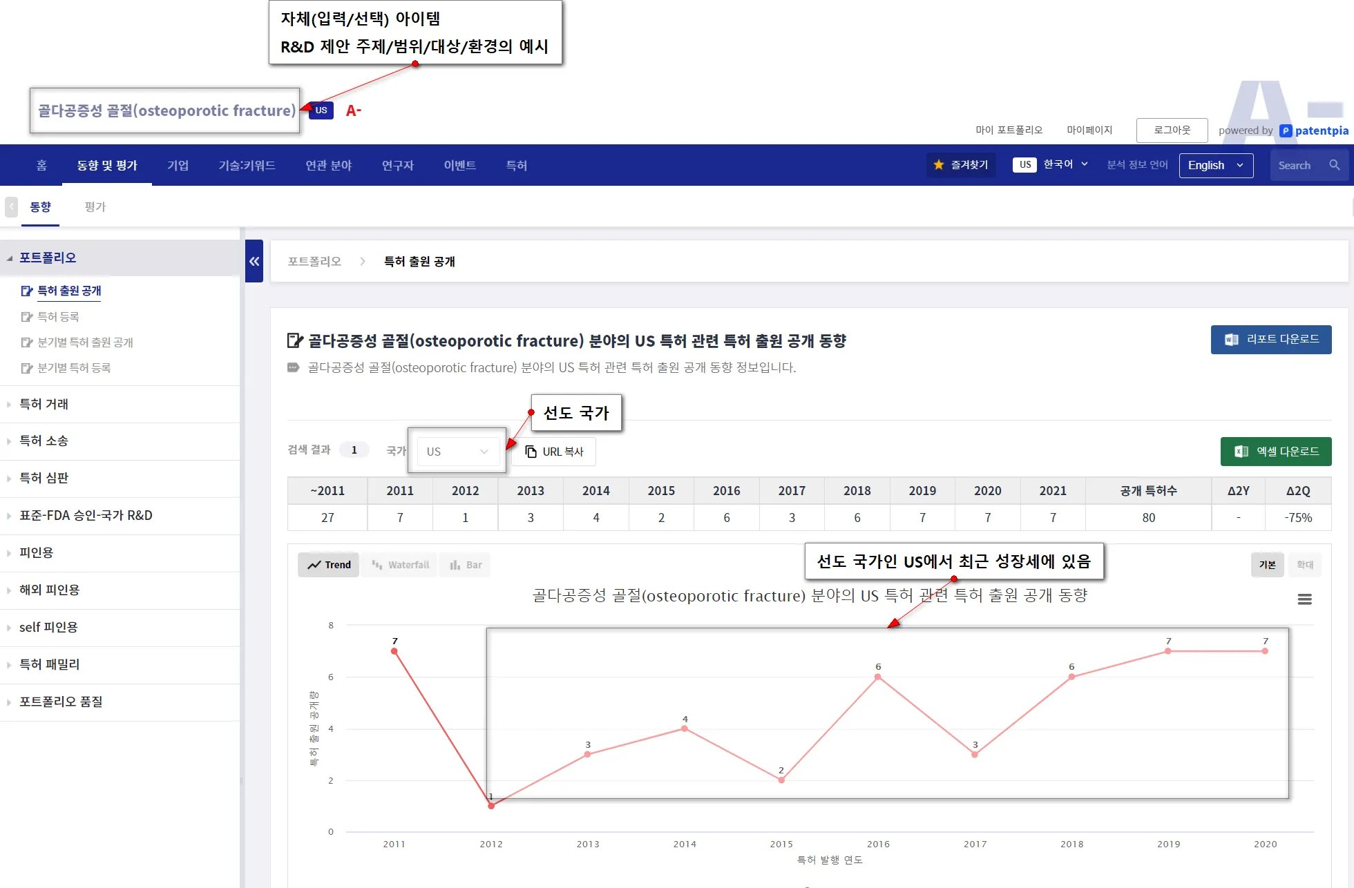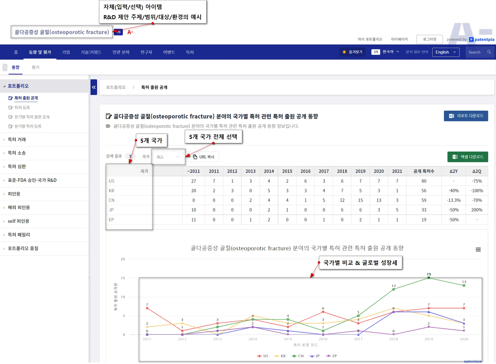 “포트폴리오” 대메뉴 아래에 있는 하위 메뉴를 통해서 각종 (국가별) 동향 분석 콘텐츠,