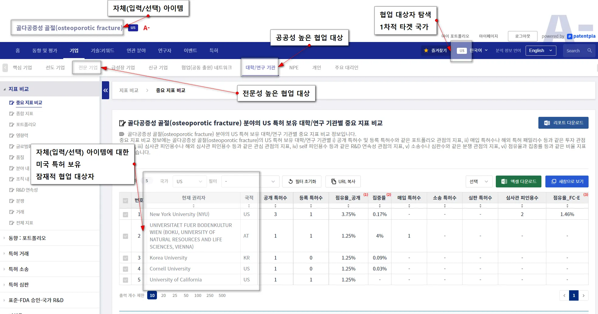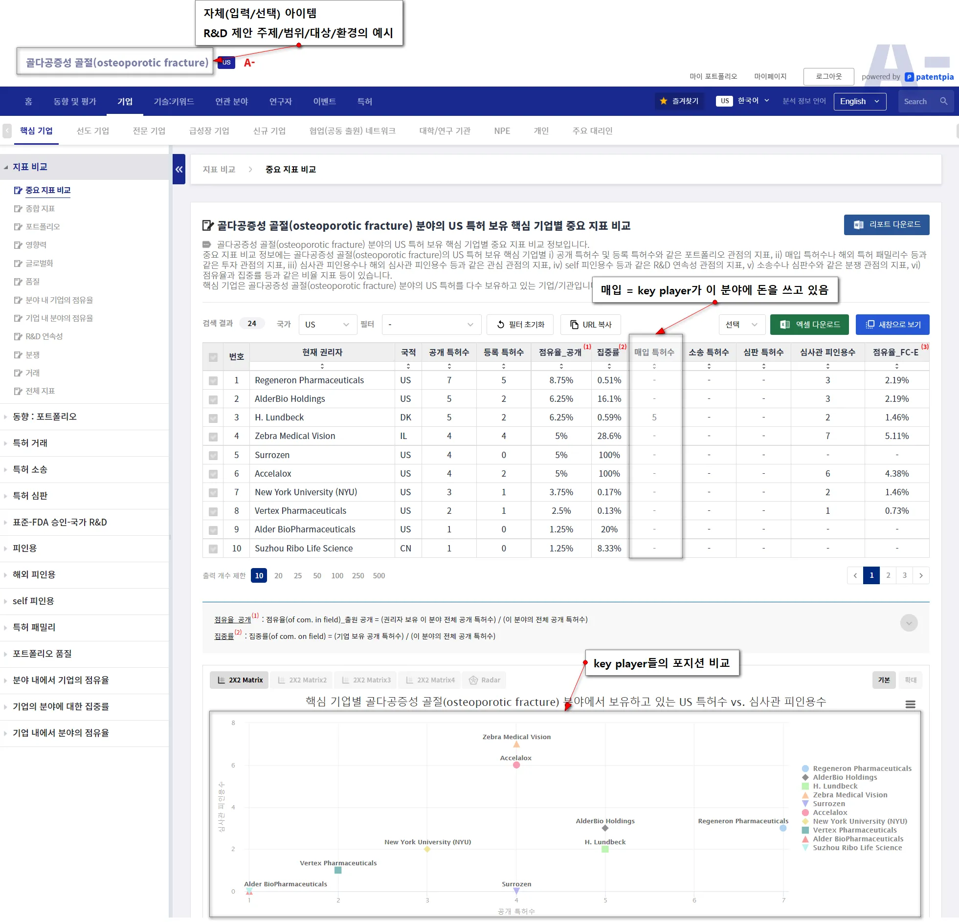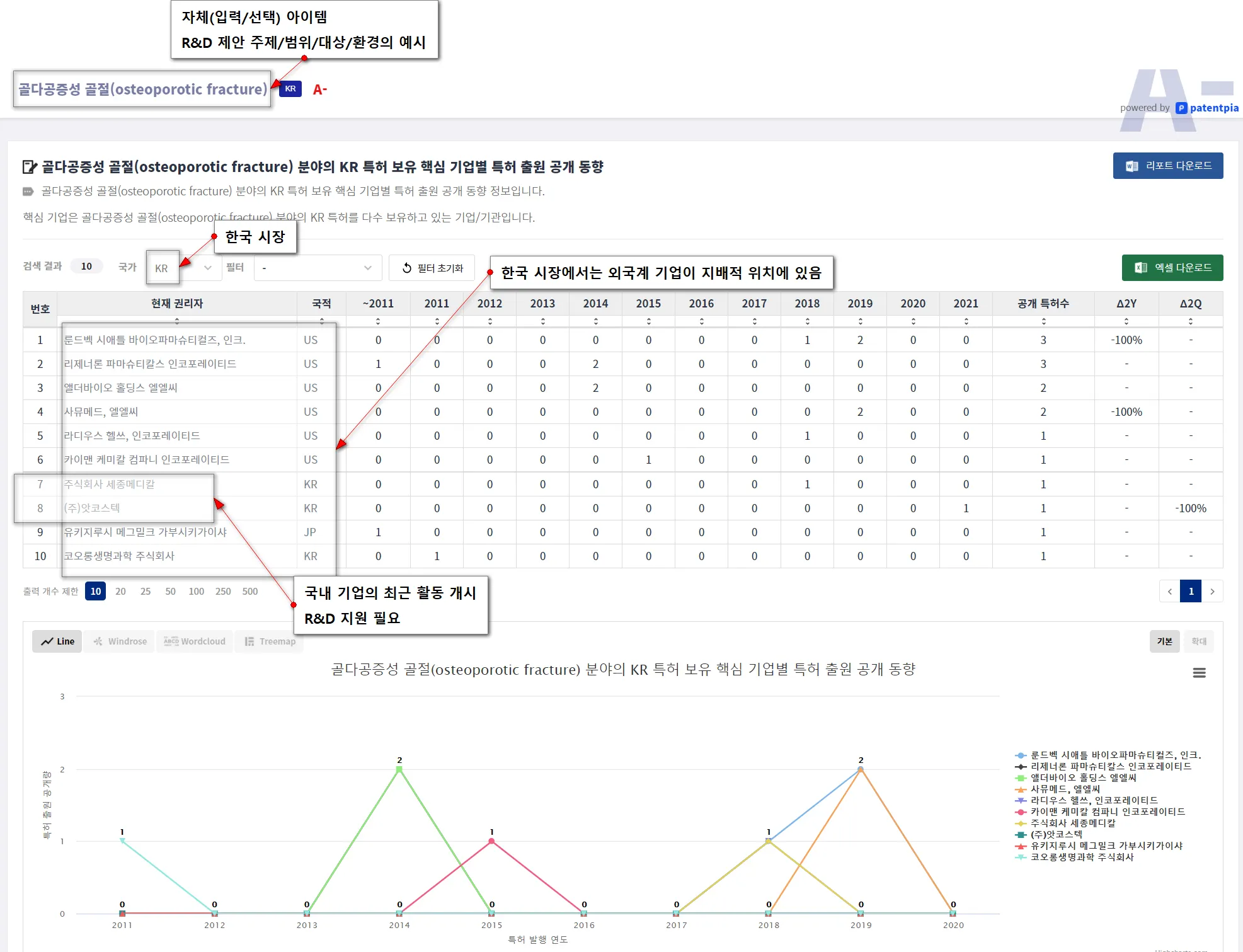 특히, i) 마켓 리더의 행위(특허 매입이나 M&A를 통한 특허 이전, M&A/투자), ii) 소송/심판 등의 분쟁과 관련된 리스크 환경의 변화, iii) 경쟁 기업/기관/국가/연구자의 신규/급등 행위나 세부 아이템 등에 초점을 맞춰야만, 시장 및 경쟁 환경에 부합하는 최종 성과를 창출할 수 있습니다.