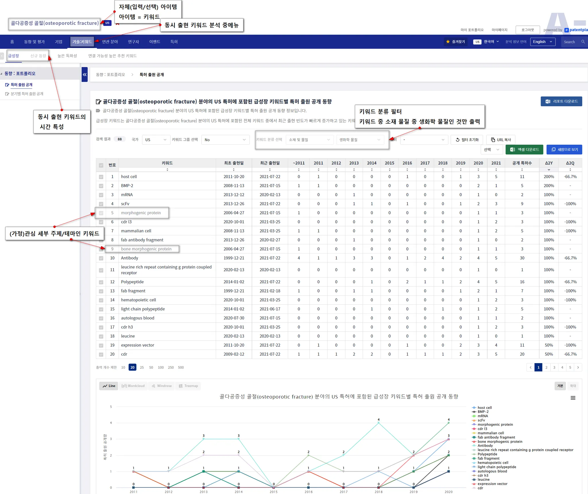 만약 위의 예시에서, 키워드 "bone morphogenic protein"이 관심 대상이라면, "bone morphogenic protein"를 클릭합니다. 이렇게 되면, "bone morphogenic protein"이 자체(입력/선택) 아이템이 되어, "bone morphogenic protein"에 대한 분석 페이지가 열립니다.