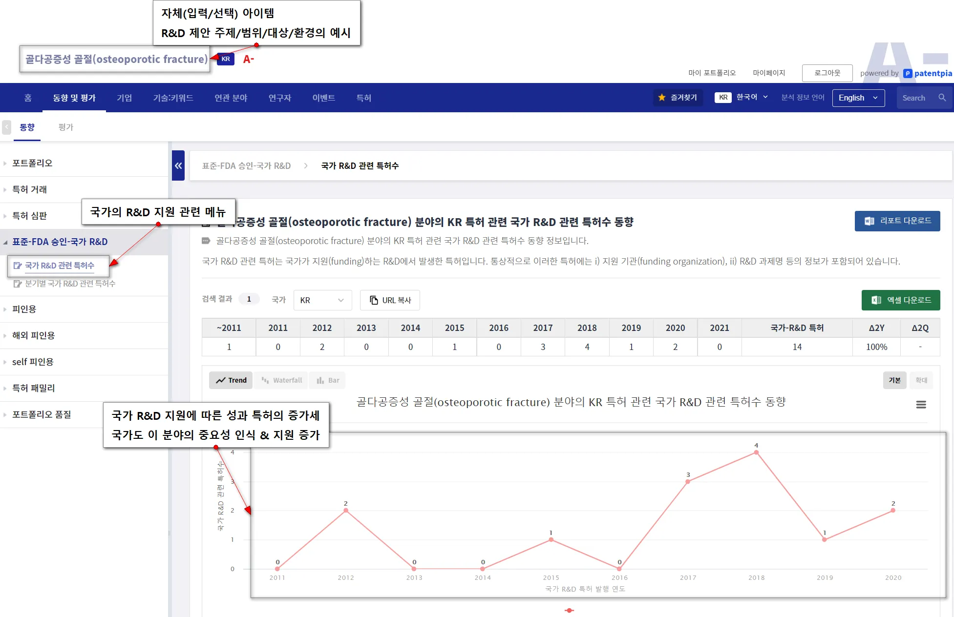 Key message : 국가 R&D 지원에 따른 성과 특허의 증가세. 국가도 이 분야의 중요성 인식 & 지원 증가
