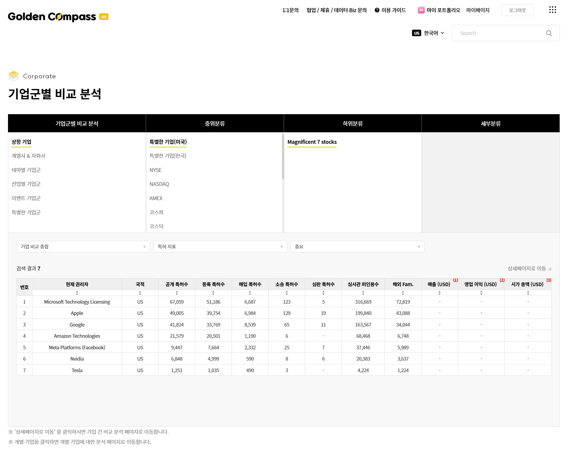 기업군별 비교 분석 영역은 PatentPia GoldenCompass main 화면 하단에 있습니다.
