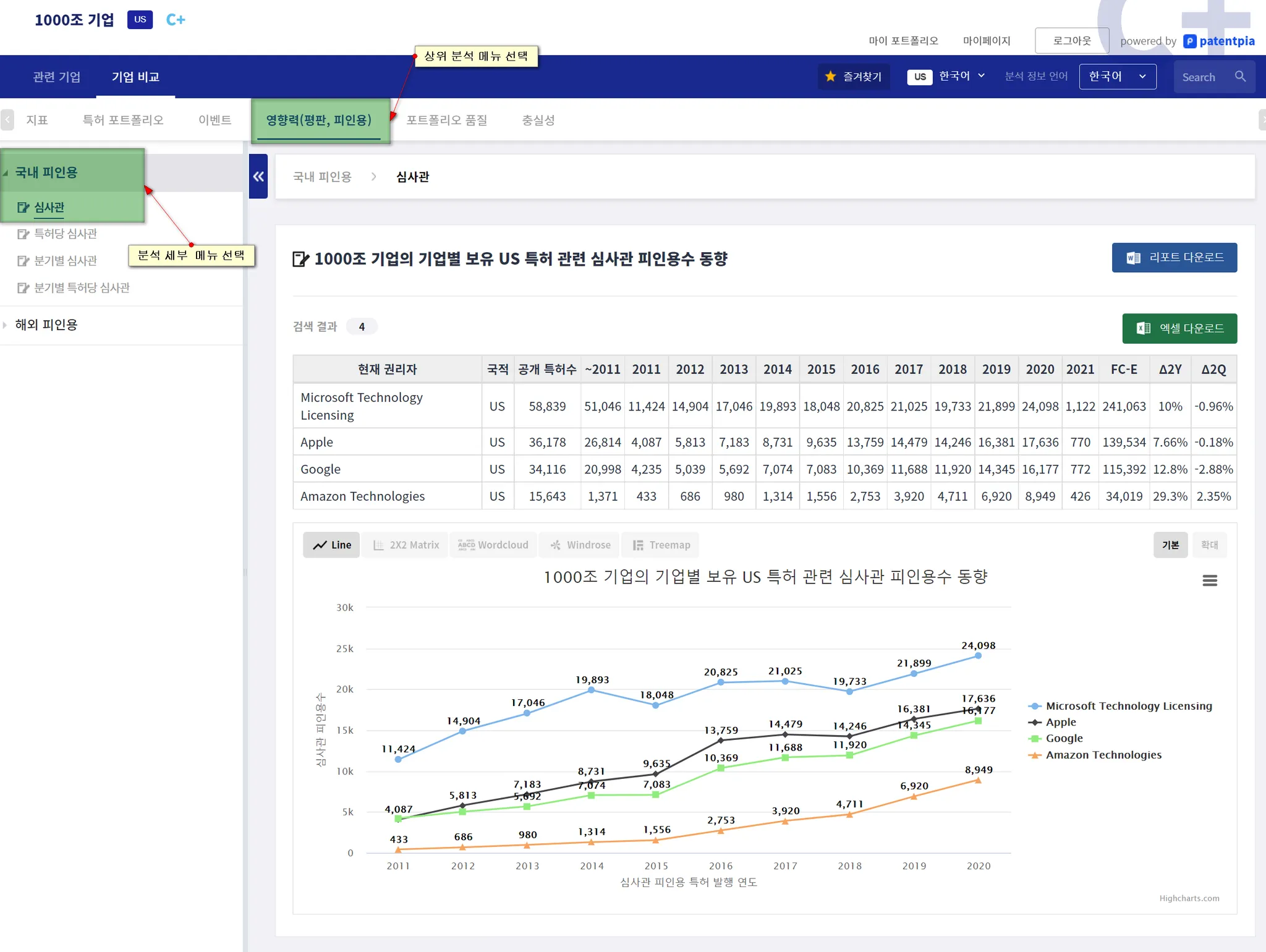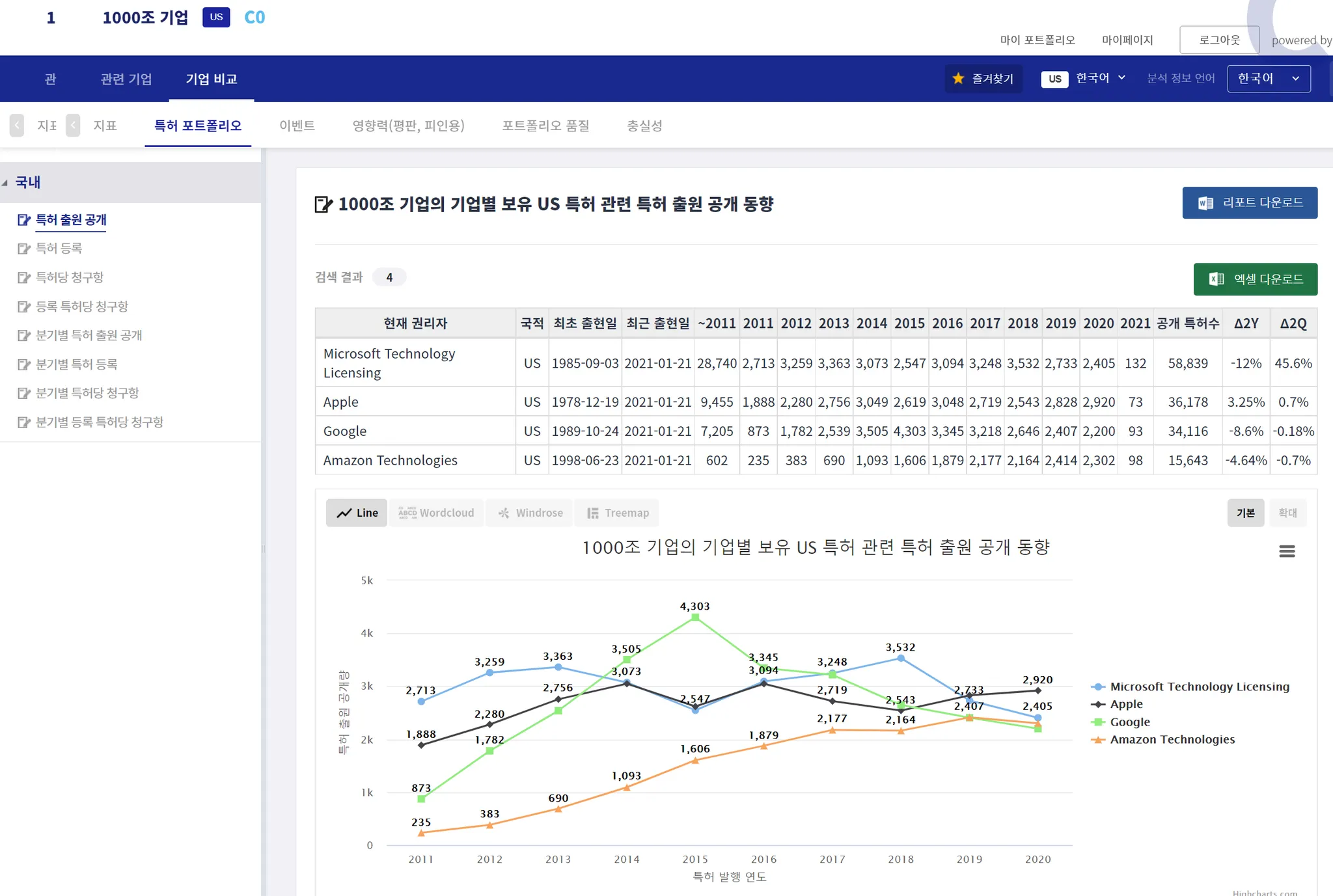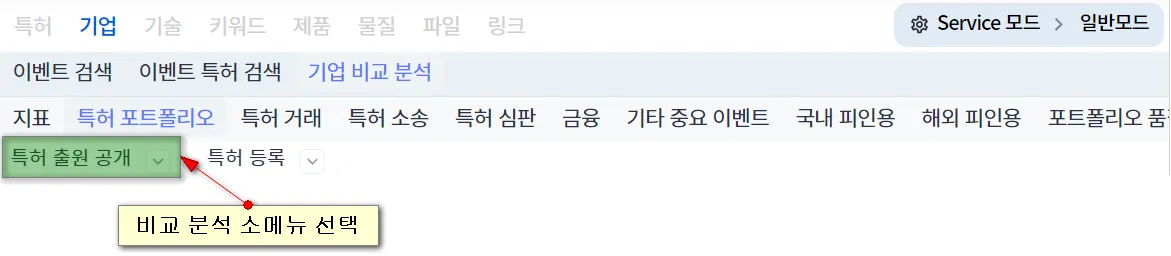 선택된 기업들을 대상으로 비교 분석할 메뉴를 선택합니다. 비교 대상이 되는 국가(특허청)를 선택할 필요가 있습니다.