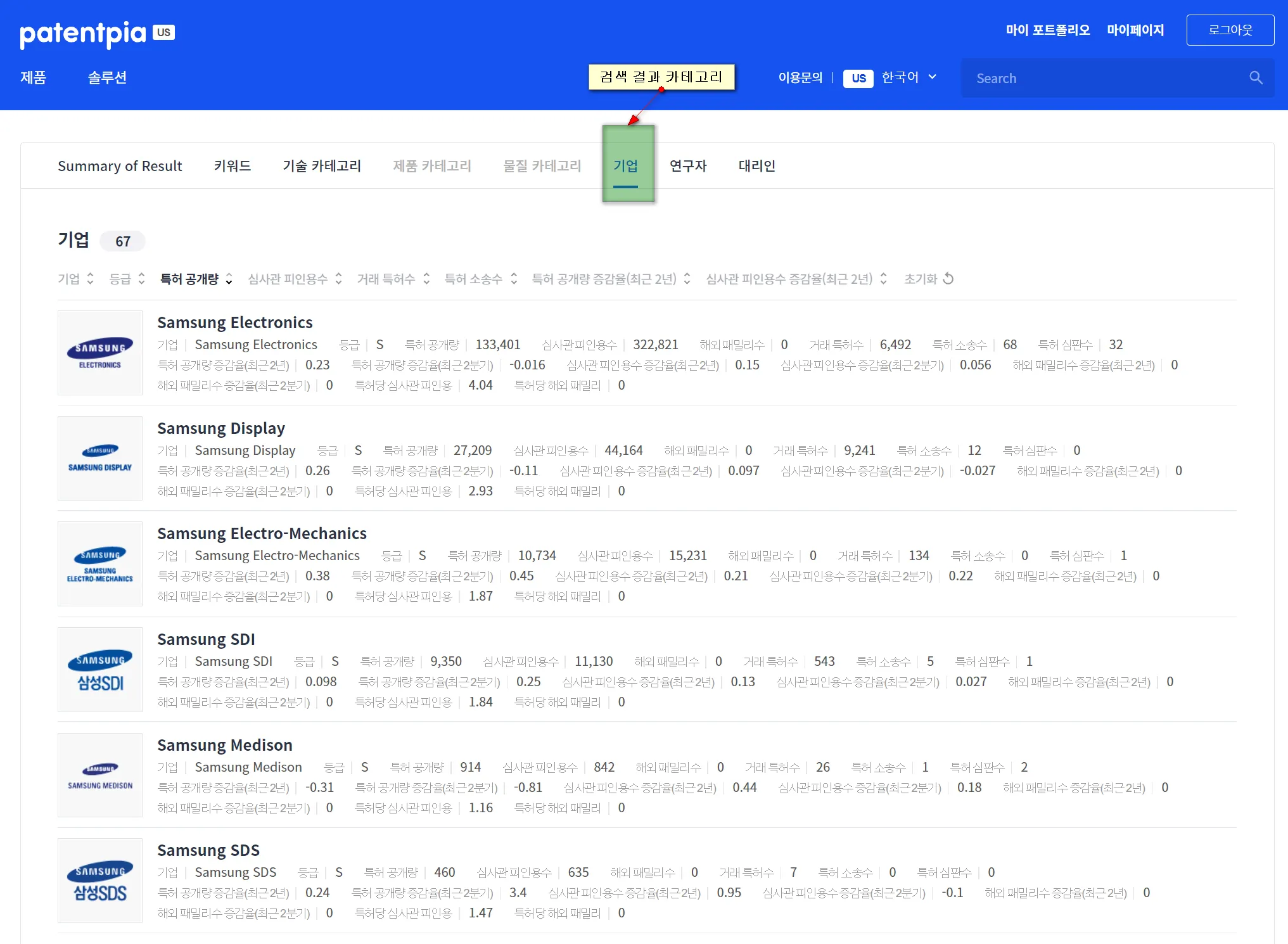 비교 대상이 되는 기업군은 i) PatentPia 등이 제공하는 주제별 기업군(given company set)과 ii) 사용자가 업로드 하는 기업군(customized company set)을 대상으로 하는 기업 비교 분석이 있습니다.