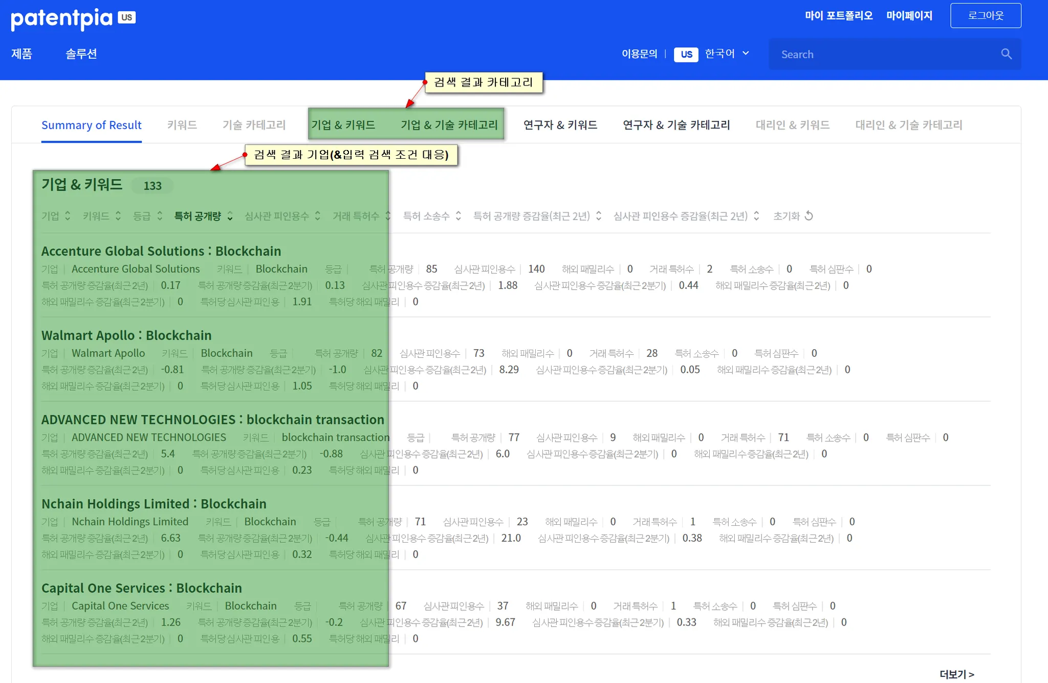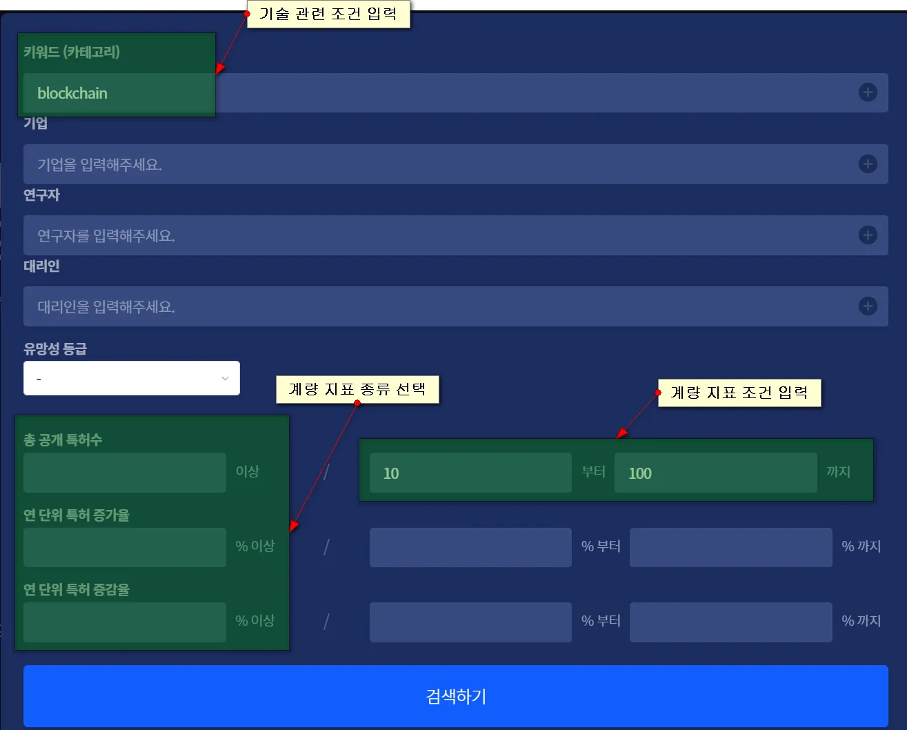 특정한 속성/특성/조건을 가지는 기업을 검색합니다. 중요한 것은 입력하는 검색어에 기업 명칭이 없다는 것입니다. 속성/조건에는 키워드나 계량 지표 조건 등이 있습니다. 예를 들어, 블록체인과 관련된 기업 중에서 특허 사이즈가 10~100인 기업을 검색합니다.