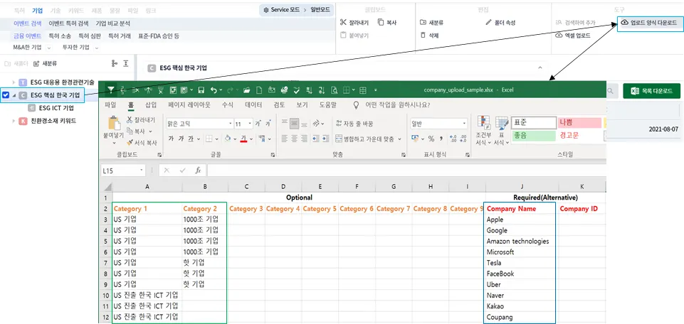 업로드 양식을 다운로드 한 후 엑셀로 대량의 기업을 한꺼번에 업로드